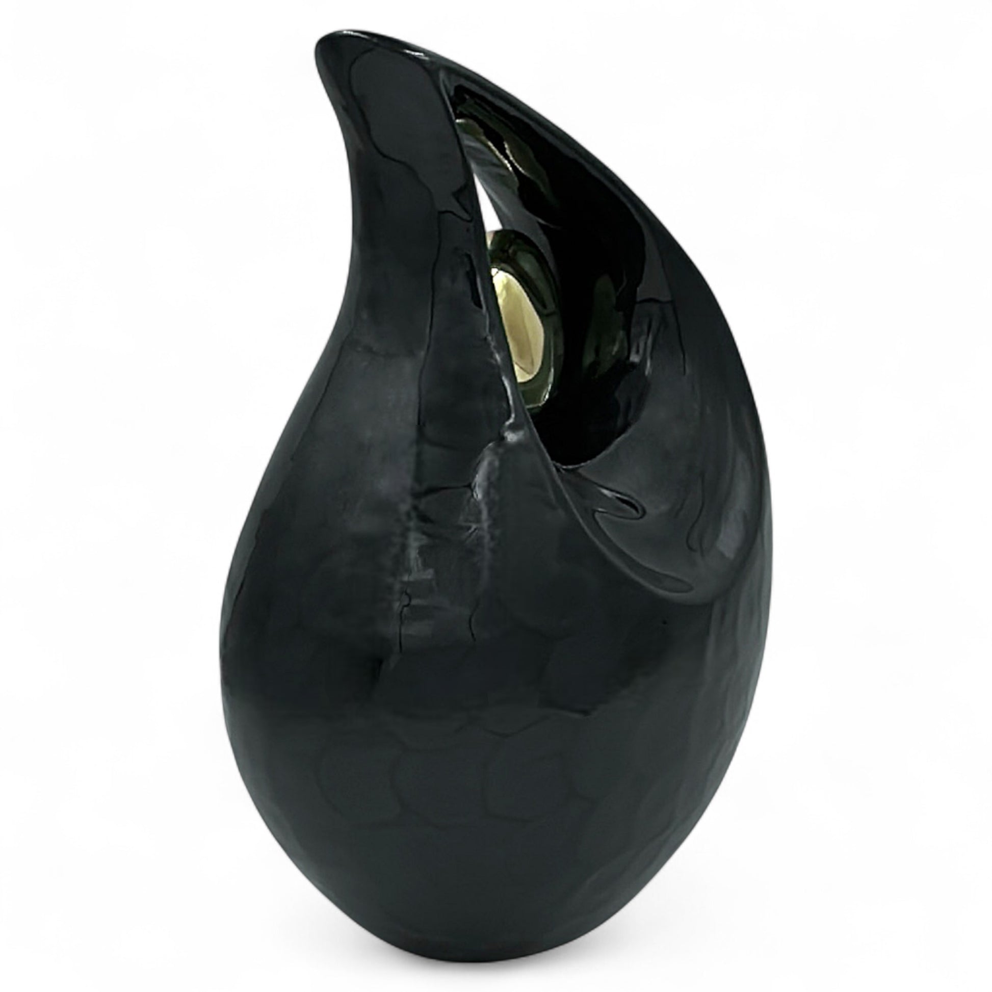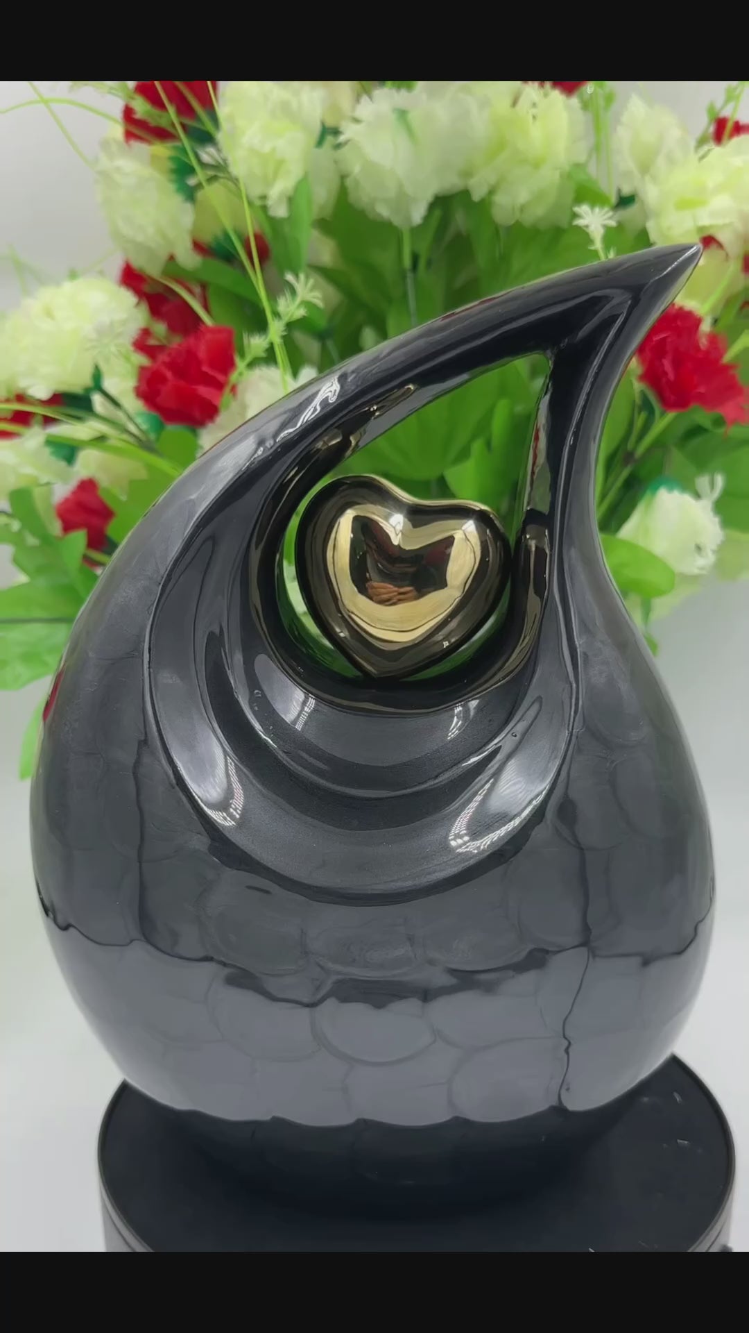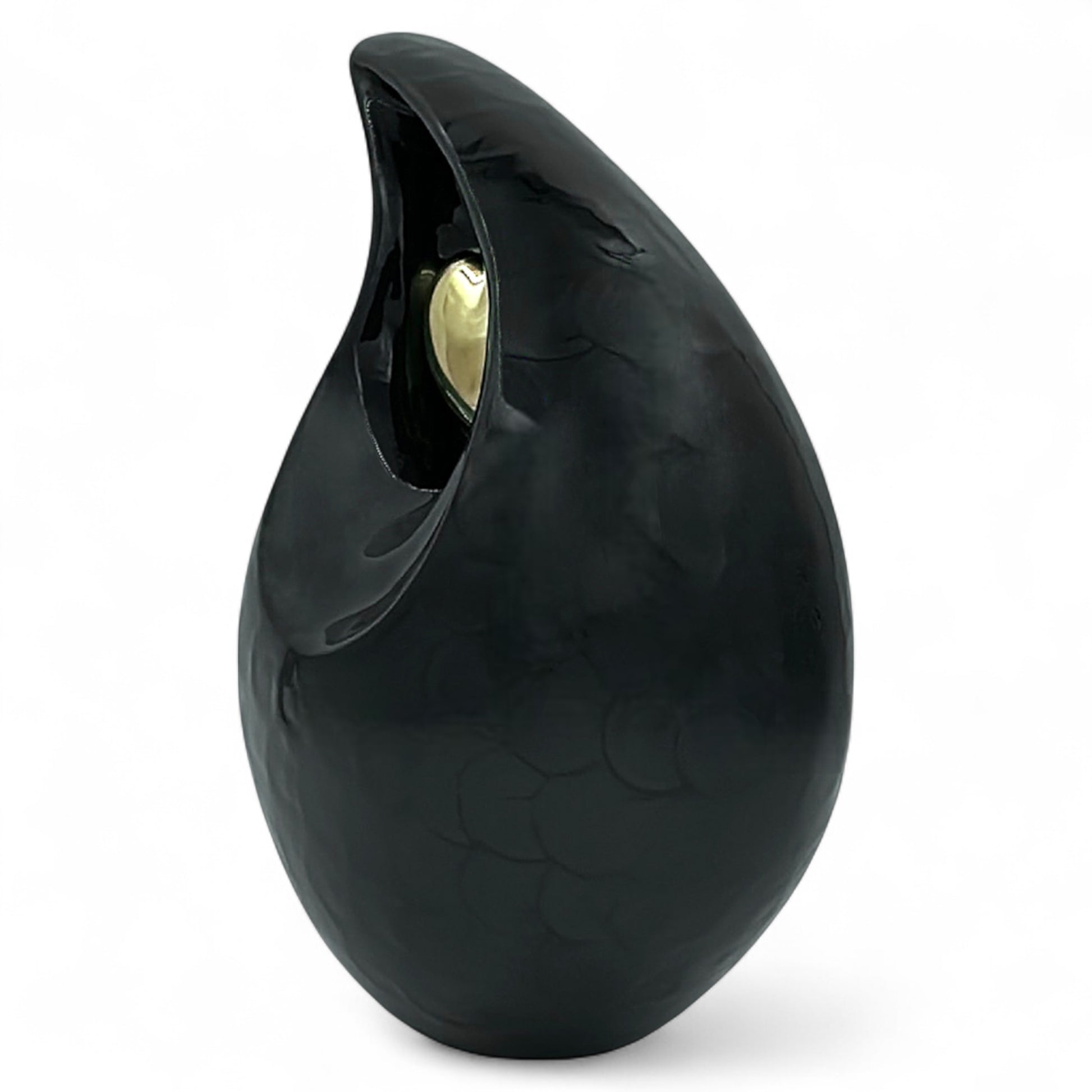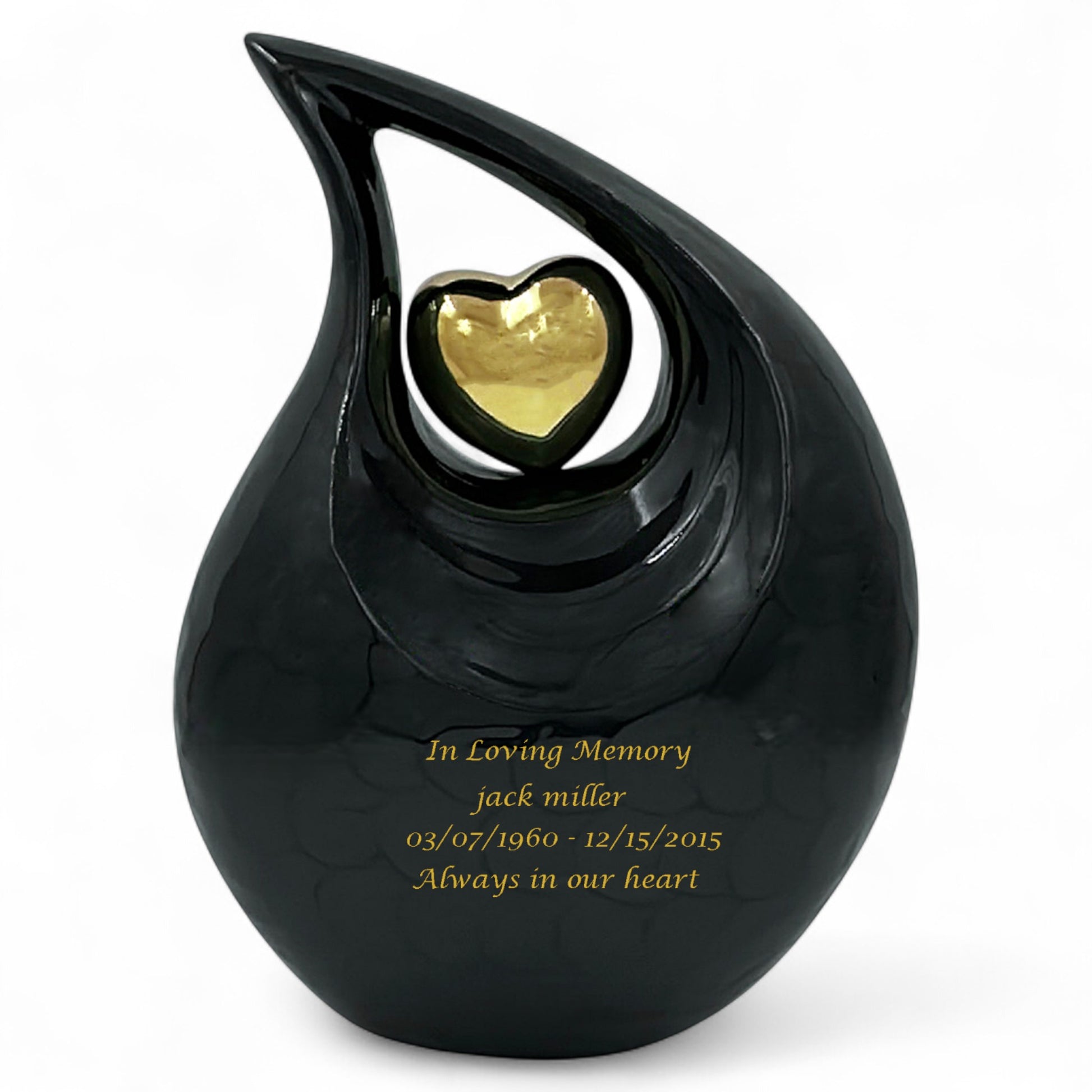 A beautifully crafted black teardrop urn with a detailed floral engraving and a heart centerpiece, symbolizing love and remembrance.